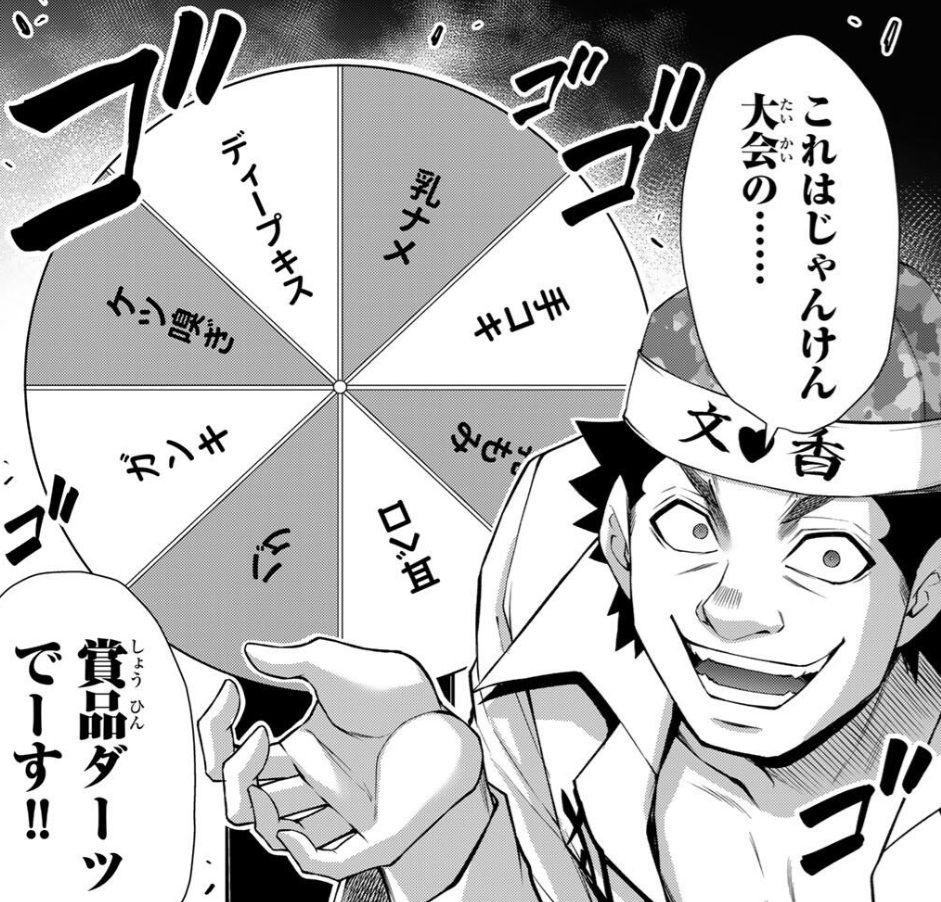 その賞品内容は「乳舐め」「手コキ」「乳もみ」「耳ベロ」「ハグ」「ガンキ」「ケツ嗅ぎ」「ディープキス」というろくでもないものばかりでした笑