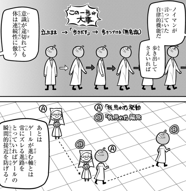 これは人間の「自律的機能」によるもので、たとえゲールの能力によって意識を遮断されても、一歩目さえ踏み出していれば無意識に歩いていられるのです。