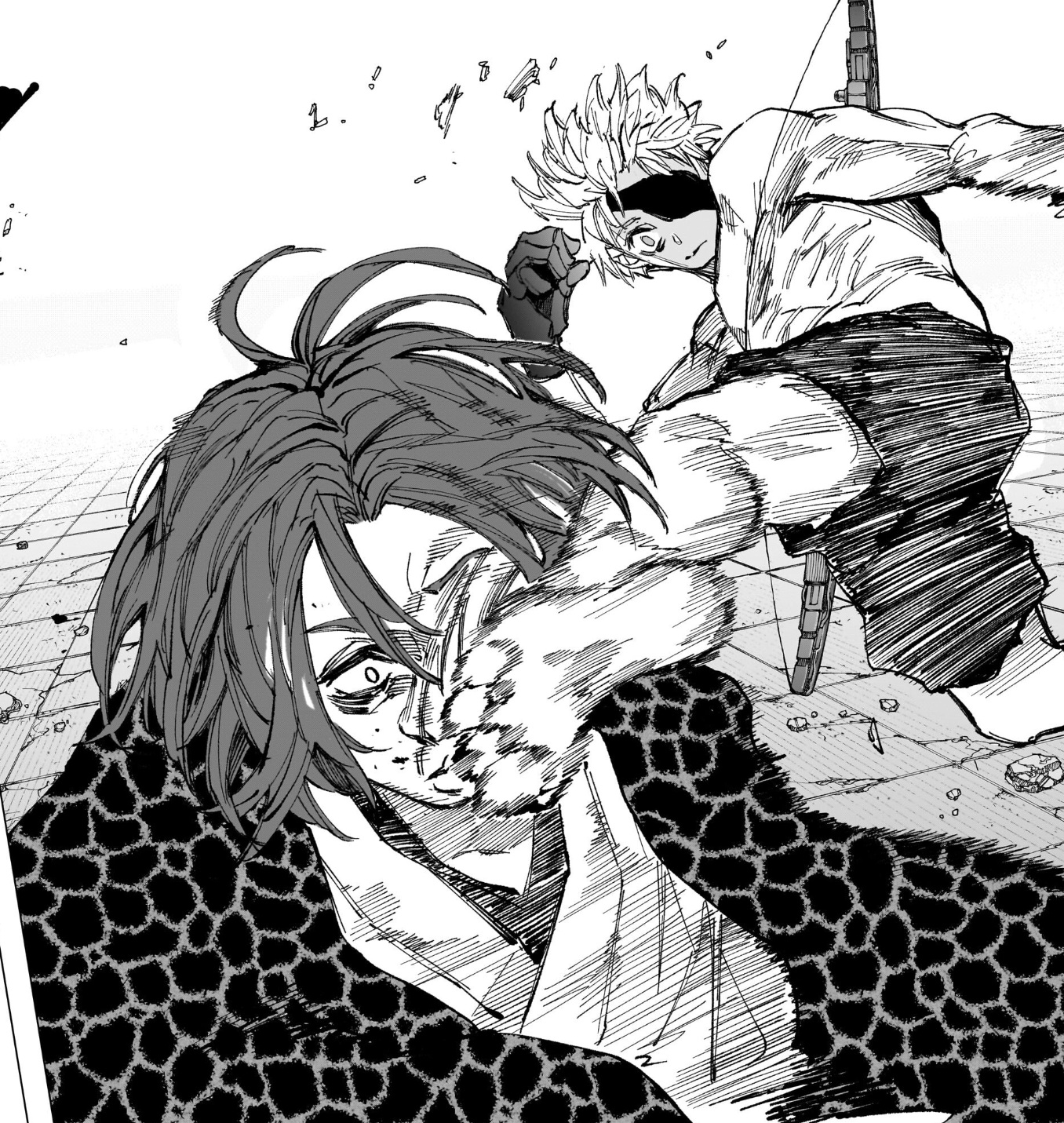 数的に大佛が不利になるも、神々廻が駆け付けてゴズを吹き飛ばし、神々廻vsゴズ、大佛vs新人の戦いが始まるのです。